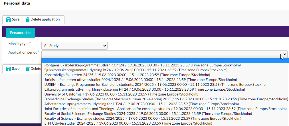 - Select an application period from the drop-down list. There are many different application periods listed, so make sure you select the right one. Note that the system displays available application periods based on the selected application type and mobility type, so make sure to choose the correct types to be able to see the relevant application periods in the drop-down list.