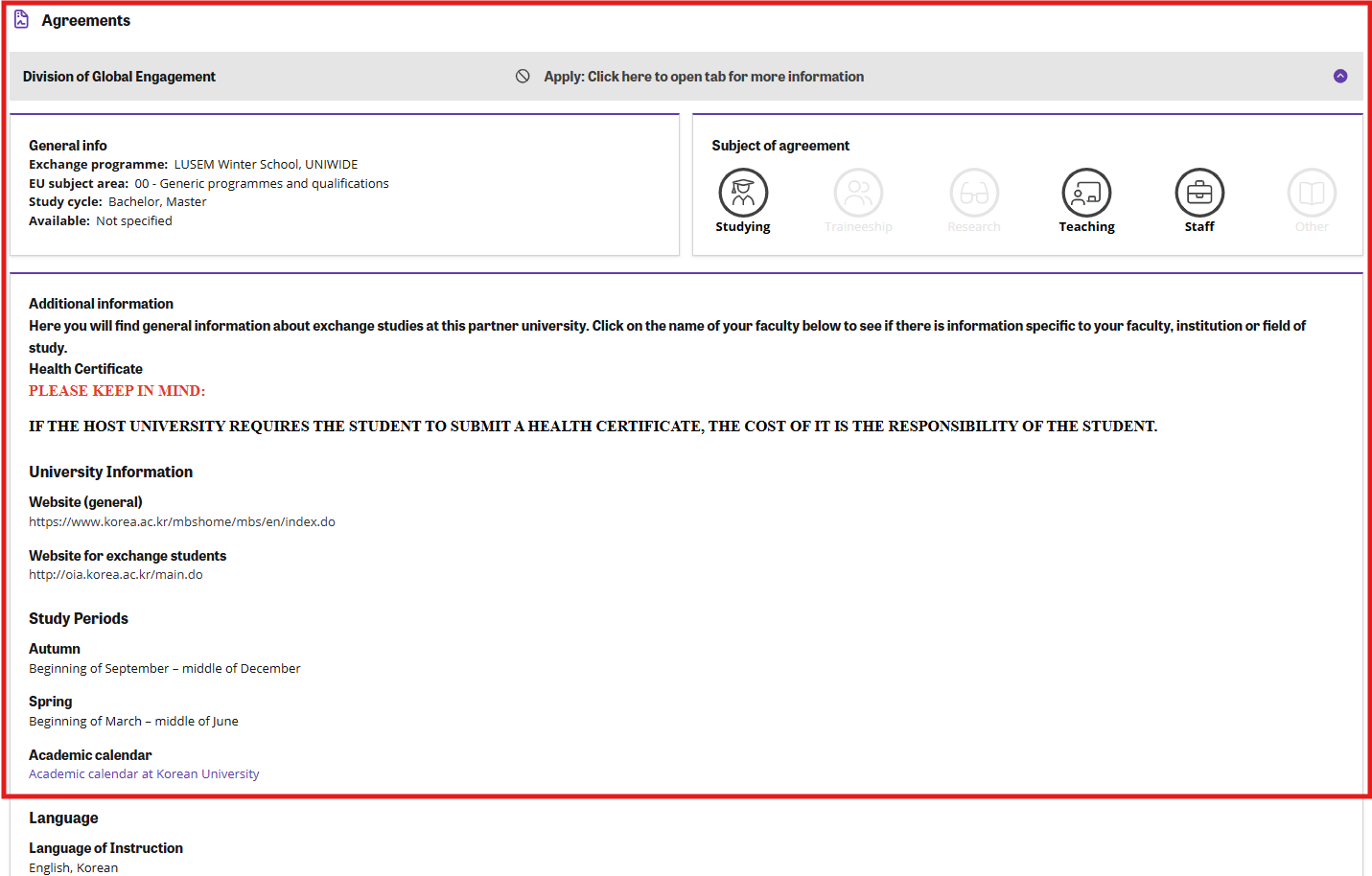 - Open the agreement called 'Division of Global Engagement' if several agreements are listed. This contains general information about this university-wide agreement. You should also open your faculty's agreement, which will help you check if anything specific has been added by your home faculty.