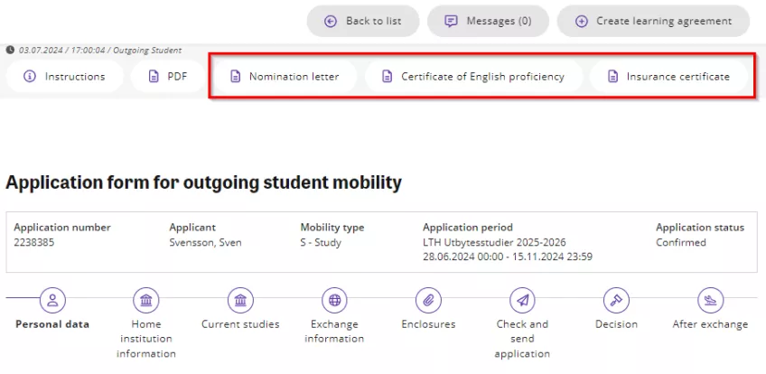 A new functionality will appear in the view, a messaging function where you can contact us regarding your application or if you have questions. Of course, you can always e-mail the International Office at your Faculty for help.