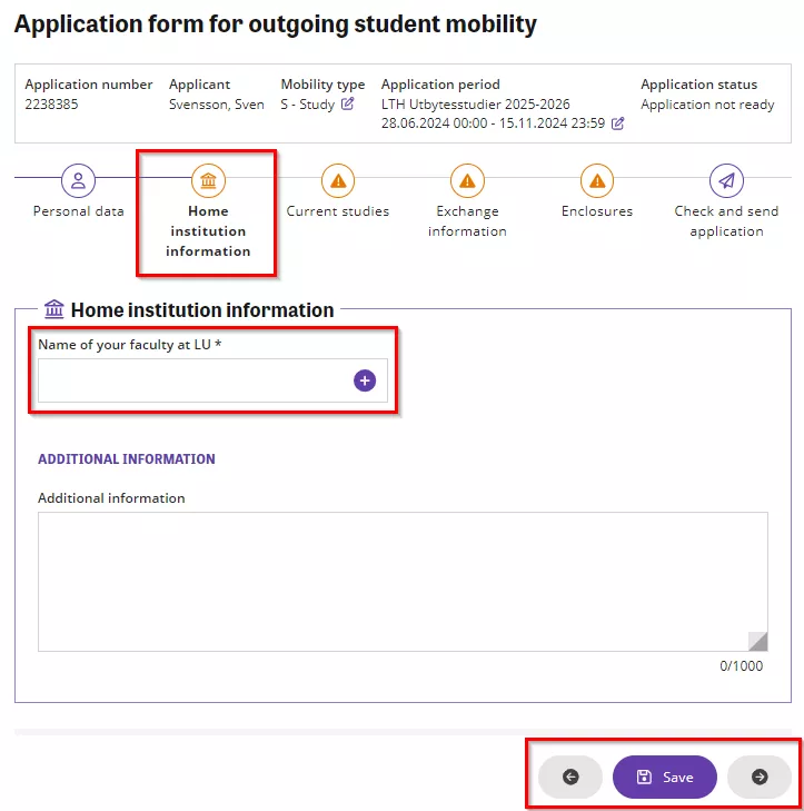 Mandatory fields are marked with an asterisk (*). After you have saved the information, the system informs you if some mandatory data is missing. You can only submit your application if mandatory information is set. The tab icon is a notification icon if mandatory data is missing, or your attention is needed.